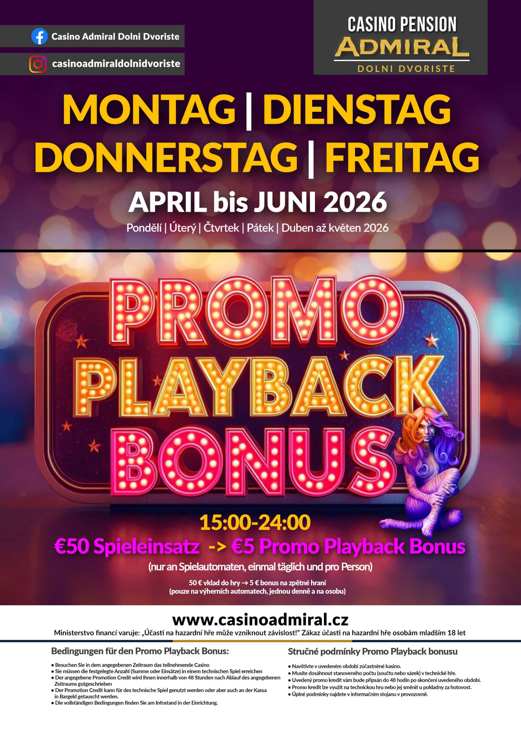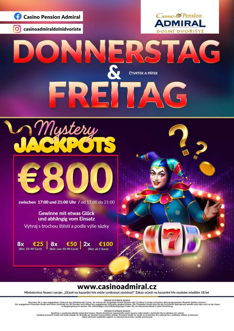 Begeben Sie sich in diese einzigartige Atmosphäre mit viel Liebe zum Detail auf eine Reise in eine andere Welt im ADMIRAL Dolní Dvořiště Casino. Spielen Sie zwischen Sanddünen, Pharaonen und Palmen. 70 moderne Spielautomaten sowie 2 Live-Game Tische (Black Jack & Admiral Texas Hold´em nur von Freitag bis Sonntag) erwarten Sie im ADMIRAL Dolní Dvořiště Casino.  Wenn Sie über Nacht bleiben, erwarten Sie 9 einfache aber gemütliche Zimmer. Das Casino ADMIRAL Dolní Dvořiště befindet sich direkt am Grenzübergang Wullowitz. Linz ist nur 50 km sowie Wels etwa 90 km entfernt.