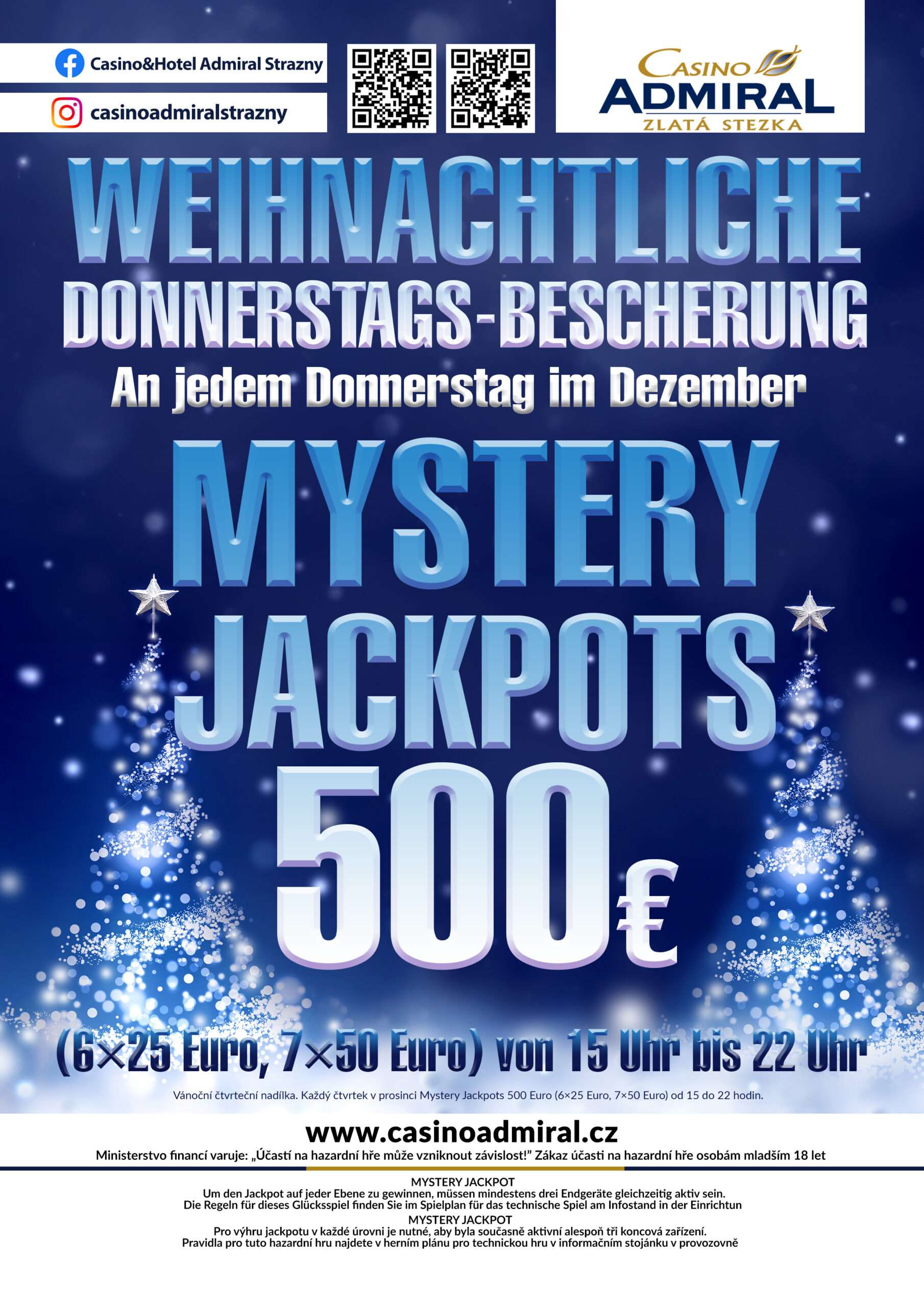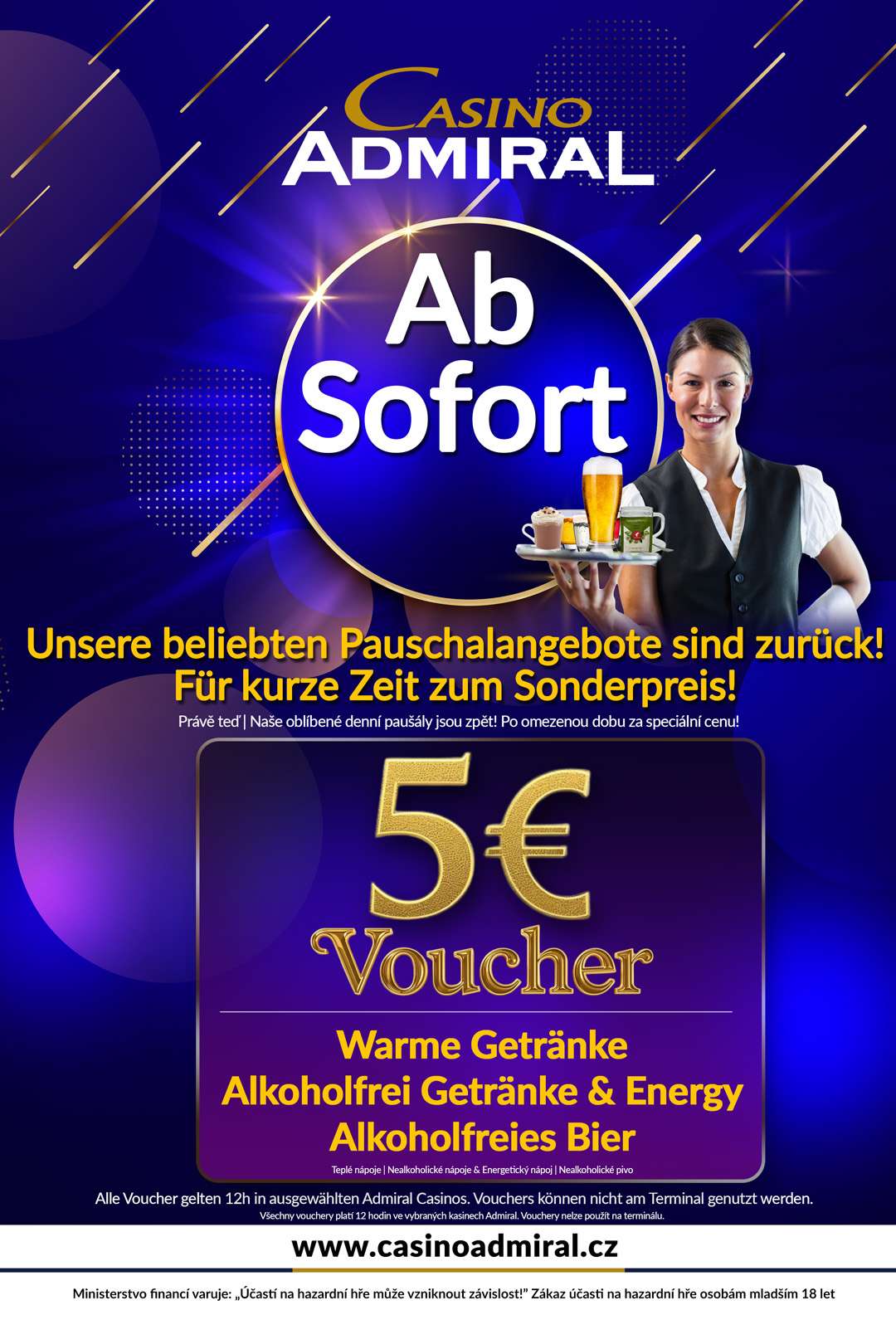 In the Casino ADMIRAL Zlatá Stezka you will find the ideal conditions to get away from it all and spend informal hours in a cozy atmosphere. All popular classic games such as Book of Ra, Lucky Ladies Charm or Sizzling Hot await you on 40 modern slot machines. The Casino ADMIRAL Zlatá Stezka is located directly at the border crossing Philippsreuth. Passau is just an hour away from this beautiful casino.The team of Casino ADMIRAL Zlatá Stezka is pleased to welcome you soon in our casino.