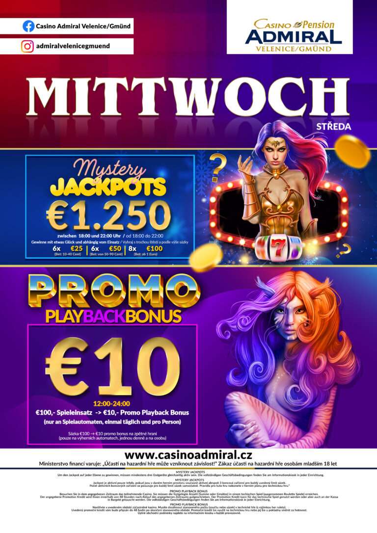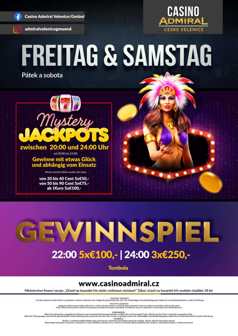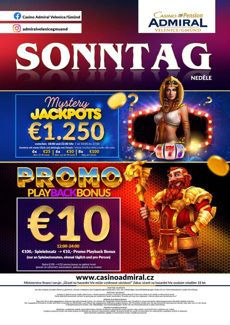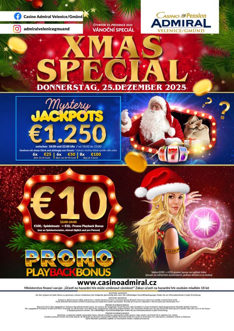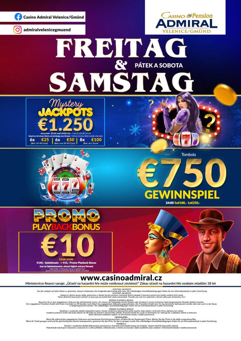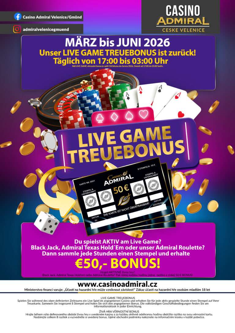 59 modern slot machines are waiting for you at Casino ADMIRAL Velenice. We also offer 3 live game tables with the casino classics American Roulette, Blackjack and Ultimate Texas Hold’em. If the night takes a little longer, our hotel rooms offer enough space for a restful night. The Casino ADMIRAL Velenice is located directly at the border crossing Gmünd. Zwettl is only a good 30 minutes away, from Krems an der Donau one travels 75 km and from Linz 90 km. tables with the casino classics American Roulette, Black Jack, Ultimate Texas Hold’em, Oasis Stud Poker and Russian Poker. After a long night, 12 luxurious hotel rooms offer the opportunity to relax. The Casino Royal ADMIRAL is located directly at the border crossing Furth im Wald. Cham is only 20 km away, Straubing 60 km and Regensburg 80 km. V případě pobytu 5ti a více nocí poskytujeme slevu 20 %.