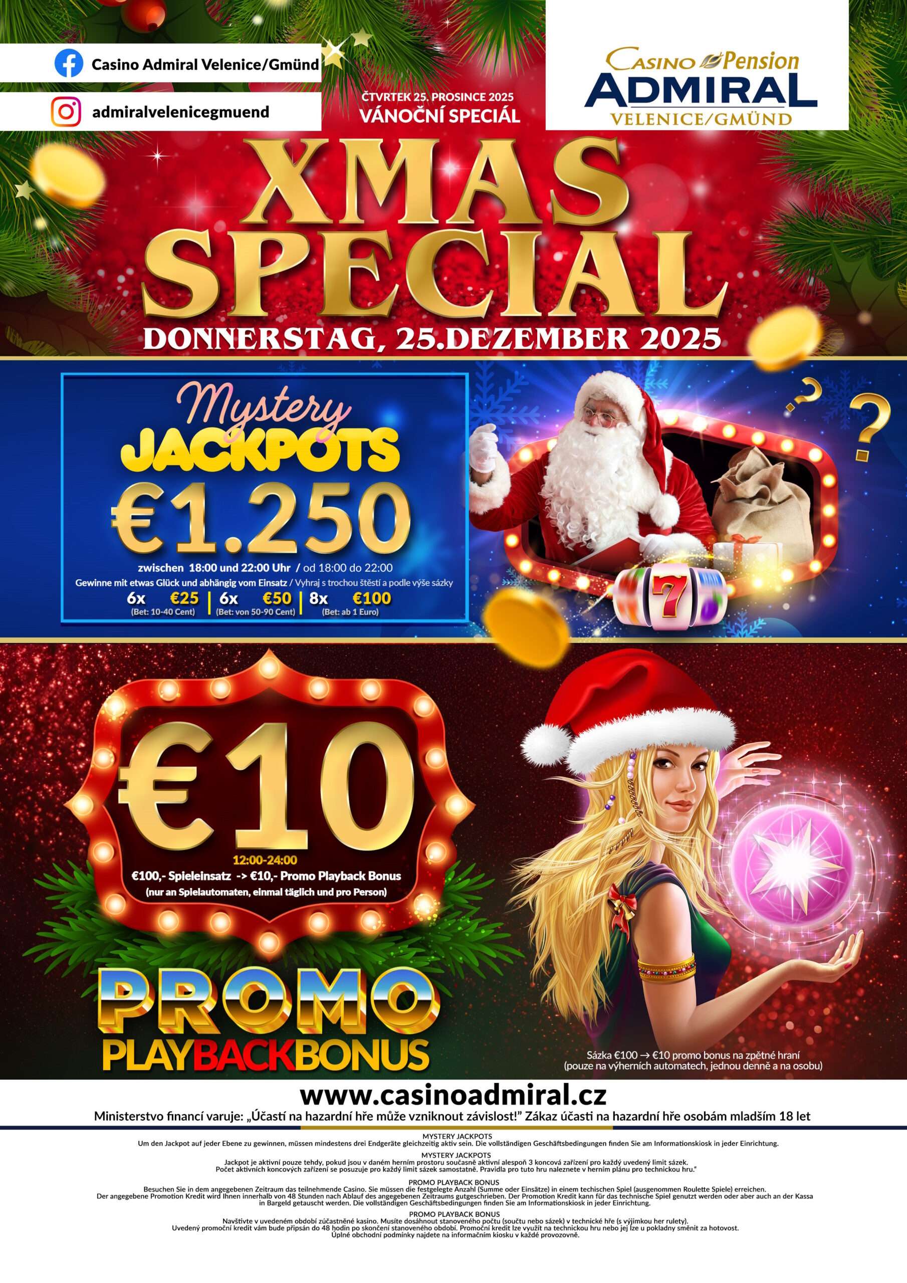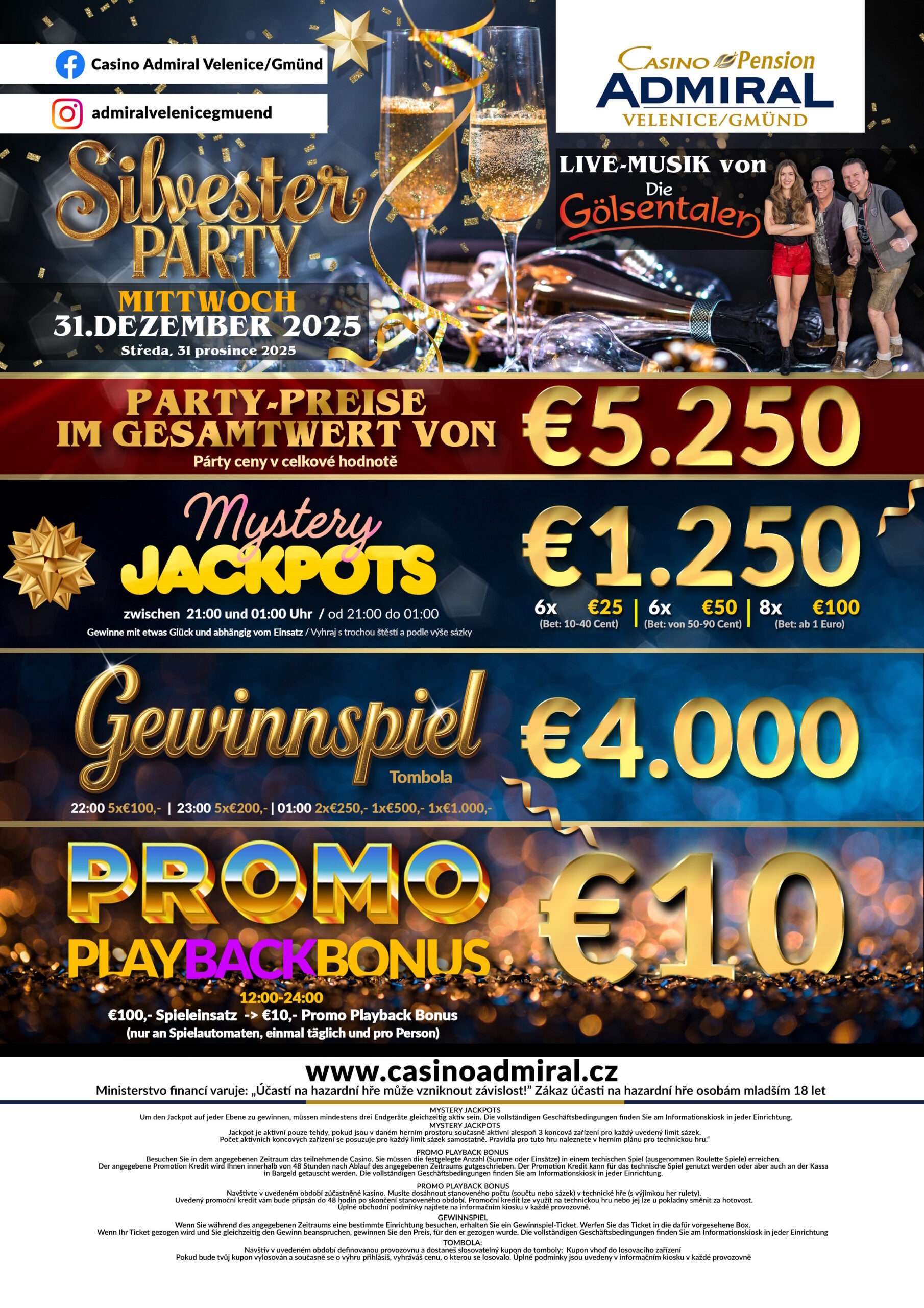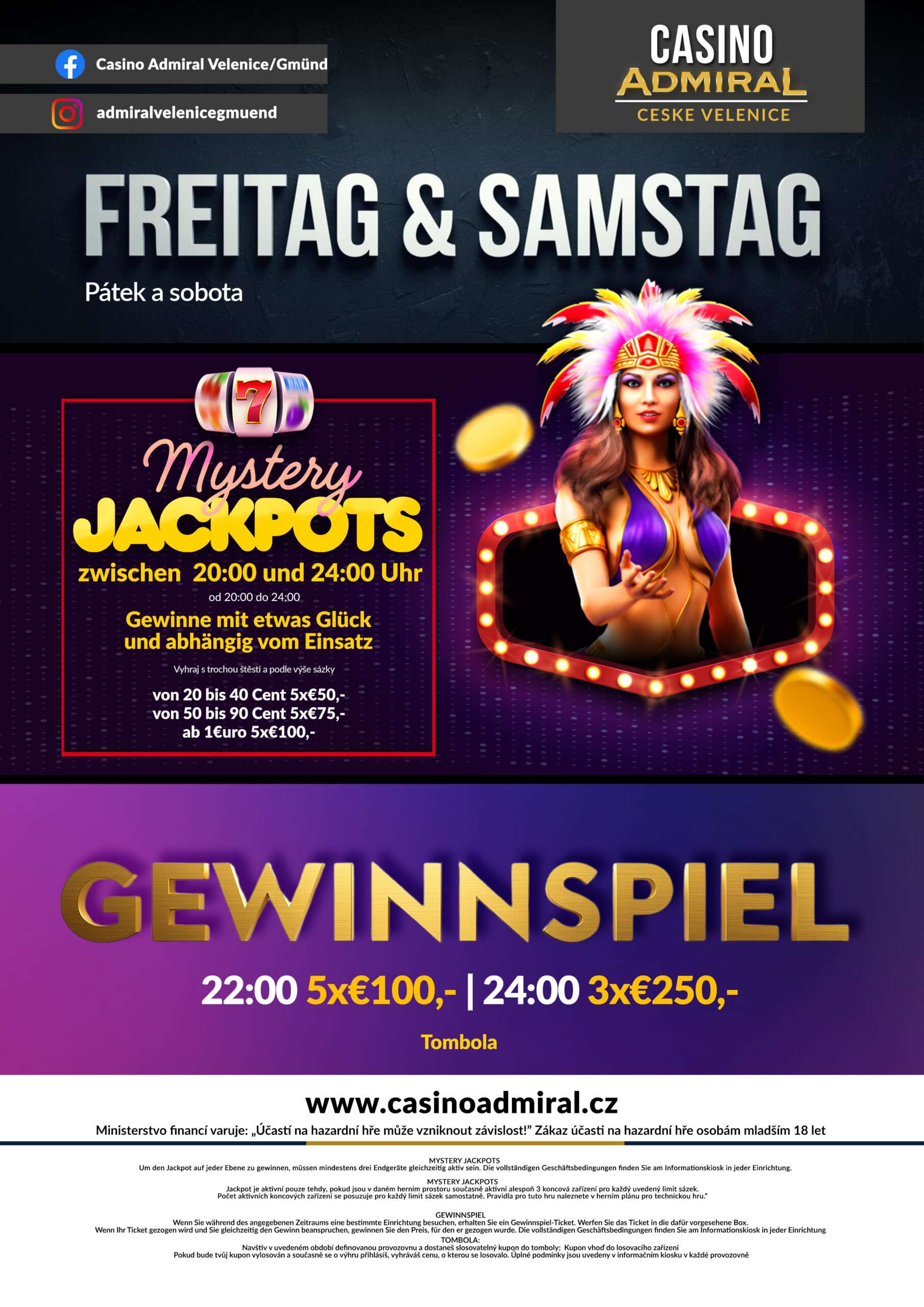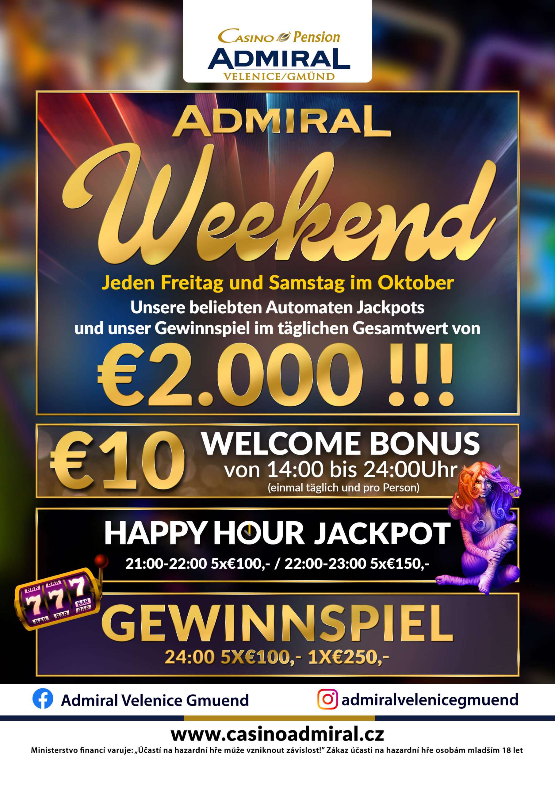 59 modern slot machines are waiting for you at Casino ADMIRAL Velenice. We also offer 3 live game tables with the casino classics American Roulette, Blackjack and Ultimate Texas Hold’em. If the night takes a little longer, our hotel rooms offer enough space for a restful night. The Casino ADMIRAL Velenice is located directly at the border crossing Gmünd. Zwettl is only a good 30 minutes away, from Krems an der Donau one travels 75 km and from Linz 90 km. tables with the casino classics American Roulette, Black Jack, Ultimate Texas Hold’em, Oasis Stud Poker and Russian Poker. After a long night, 12 luxurious hotel rooms offer the opportunity to relax. The Casino Royal ADMIRAL is located directly at the border crossing Furth im Wald. Cham is only 20 km away, Straubing 60 km and Regensburg 80 km. V případě pobytu 5ti a více nocí poskytujeme slevu 20 %.